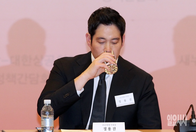 정용진 신세계그룹 부회장이 16일 오후 서울 남대문로 대한상공회의소에서 열린 '새누리당-대한상공회의소 정책간담회'에 참석해 물을 마시고 있다.