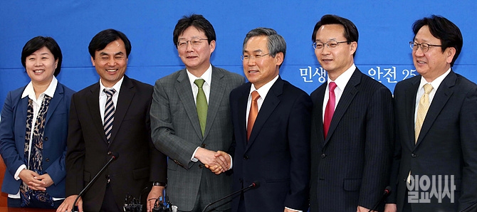 16일, 서울 여의도 국회에서 새누리당 유승민·새정치민주연합 우윤근 여야 원내대표(사진 가운데) 등 원내대표단이 주례회동 직전, 포토타임서 악수를 나누고 있다.