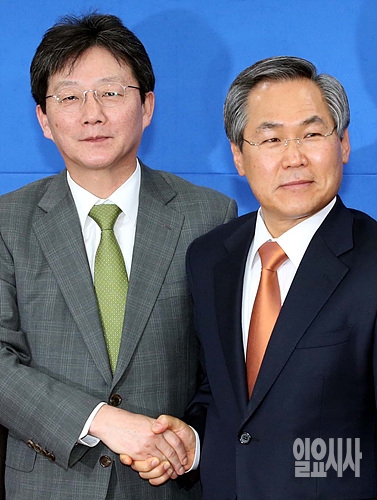 16일, 서울 여의도 국회에서 새누리당 유승민·새정치민주연합 우윤근 여야 원내대표가 주례회동 직전, 악수를 나누고 있다.