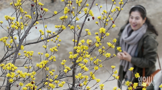 서울 최고기온이 17도를 기록하는 등 전국이 올들어 가장 따뜻한 날씨를 보인 16일 오후 서울 청계천에 산수유꽃이 활짝 피어있다.