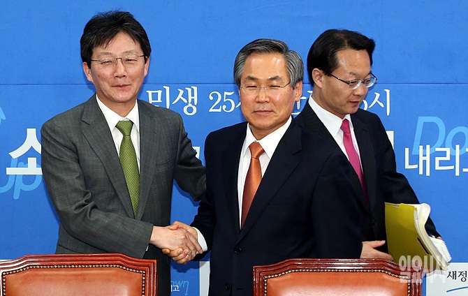 16일, 서울 여의도 국회에서 새누리당 유승민·새정치민주연합 우윤근 원내대표가 주례회동 직전, 악수를 나누고 있다.