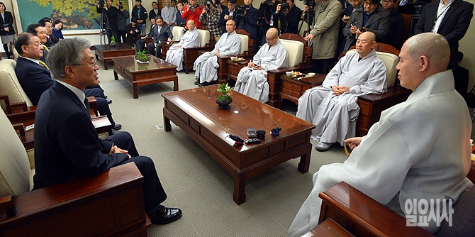 16일 오후, 문재인 새정치민주연합 대표가 서울 종로구 견지동에 위치한 조계사를 방문해 자승 스님을 예방한 자리에서 이야기를 나누고 있다.