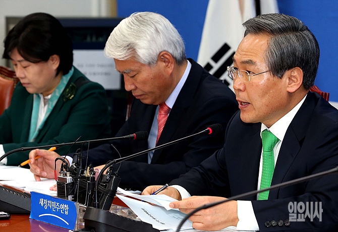17일, 서울 여의도 국회에서 열린 새정치민주연합 원내대책회의서 우윤근 원내대표가 모두발언하고 있다.