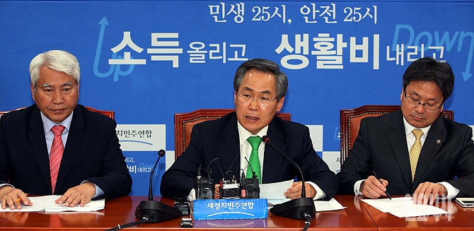 17일, 서울 여의도 국회에서 열린 새정치민주연합 원내대책회의서 우윤근 원내대표가 모두발언하고 있다.