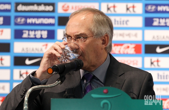 울리 슈틸리케 국가대표 축구팀 감독이 17일 오전 서울 신문로 축구회관에서 오는 27일(우즈벡), 31일(뉴질랜드)에 있을 평가전에 출전할 선수들의 명단을 발표하는 도중 목을 축이고 있다.