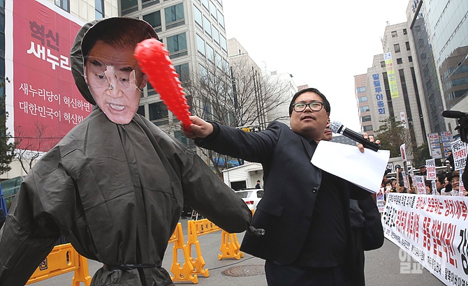 17일, 서울 여의도 새누리당 당사 앞에서 어버이연합 회원들이 이명박 정부의 자원외교 부정부패에 대한 강력한 처벌을 요구하는 집회를 갖고 있다.