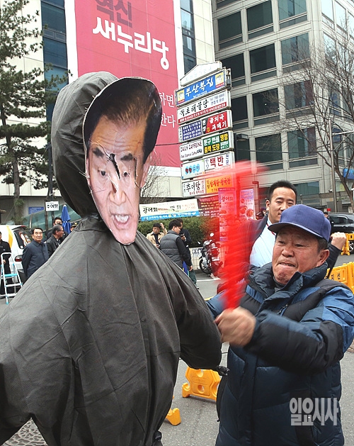 17일, 서울 여의도 새누리당 당사 앞에서 어버이연합 회원들이 이명박 정부의 자원외교 부정부패에 대한 강력한 처벌을 요구하는 집회를 갖고 있다.