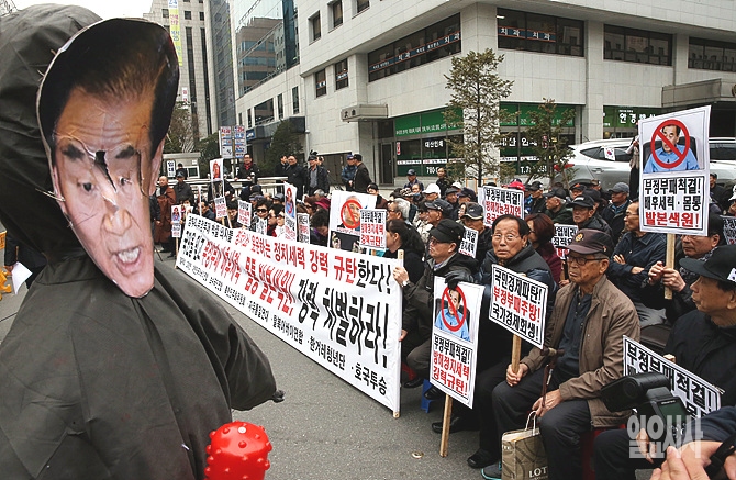 17일, 서울 여의도 새누리당 당사 앞에서 어버이연합 회원들이 이명박 정부의 자원외교 부정부패에 대한 강력한 처벌을 요구하는 집회를 갖고 있다.