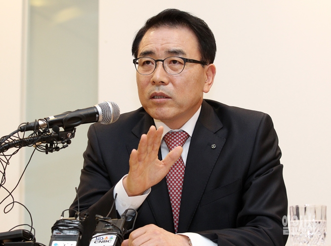 신한은행 조용병 신임 은행장이 18일 오후 서울 중구 태평로 신한은행 본점에서 열린 취임 기자간담회에서 취재진의 질문에 답하고 있다.