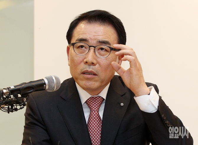 신한은행 조용병 신임 은행장이 18일 오후 서울 중구 태평로 신한은행 본점에서 열린 취임 기자간담회에서 취재진의 질문에 답하고 있다.