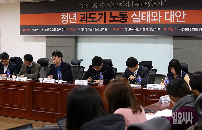 18일, 서울 여의도 국회 의원회관에서 '청년 과도기 노동 실태와 대안' 토론회가 열리고 있는 가운데, 정준영 청년유니언 정책국장이 발언하고 있다.
