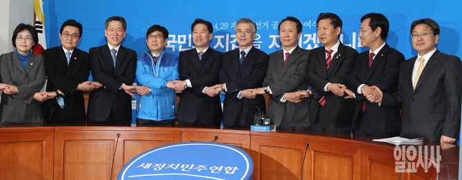 19일 오전 서울 여의도 국회 새정치민주연합 대표회의실에서 열린 '4.29 재보궐선거 후보자 공천장 수여식'에서 문재인 대표를 비롯한 지도부와 후보자들이 기념촬영을 하고 있다.