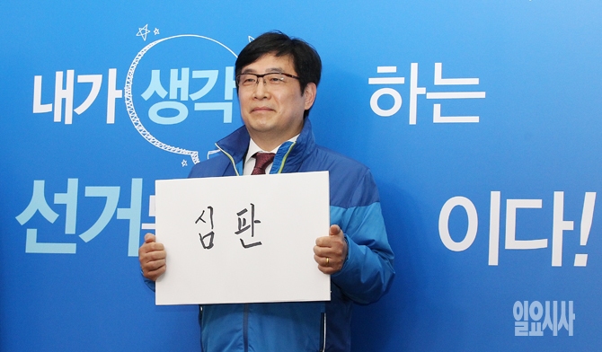 19일 오전 서울 여의도 국회 새정치민주연합 대표회의실에서 열린 '4.29 재보궐선거 후보자 공천장 수여식'에서 정환석 경기 성남중원 후보자가 4·29 재보선에 대한 생각을 쓴 피켓을 들고 있다.