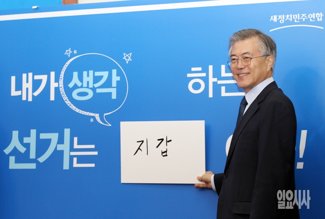 19일 오전 서울 여의도 국회 새정치민주연합 대표회의실에서 열린 '4.29 재보궐선거 후보자 공천장 수여식'에서 문재인 새정치민주연합 대표가 4·29 재보선에 대한 생각을 쓴 피켓을 들고 있다.