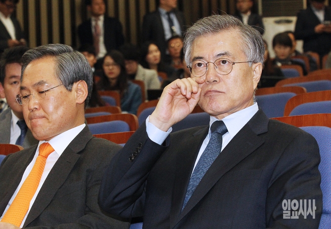 새정치민주연합 문재인 대표(오른쪽)가 19일 서울 여의도 국회에서 열린 정책 의원총회에 참석해 안경을 고쳐쓰고 있다.