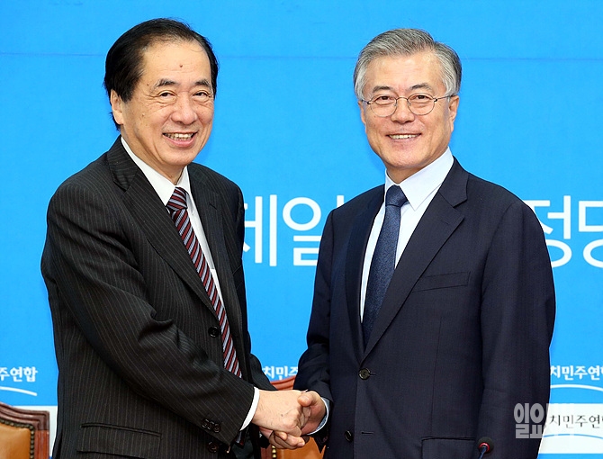 19일, 간 아오토 전 일본총리가 서울 여의도 국회 새정치민주연합 문재인 대표를 예방한 자리에서 반가움의 악수를 나누고 있다.