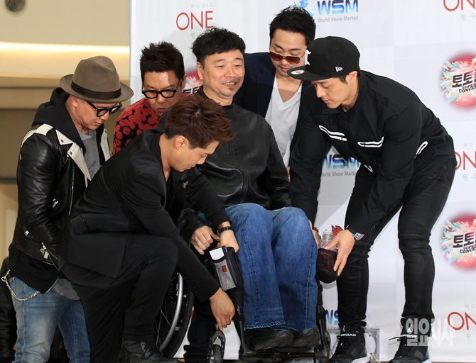 19일 오후 서울 영등포 타임스퀘어에서 열린 '토토즐 슈퍼콘서트' 제작발표회에서 휠체어를 탄 가수 강원래가 무대 위로 올라가는 것을 동료 가수들이 도와주고 있다.