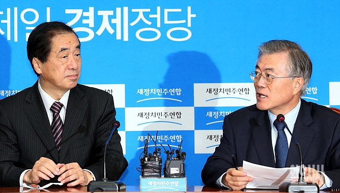 19일, 간 아오토 전 일본총리가 서울 여의도 국회 새정치민주연합 문재인 대표를 예방한 가운데, 문 대표가 아오토 전 총리를 바라보고 있다.