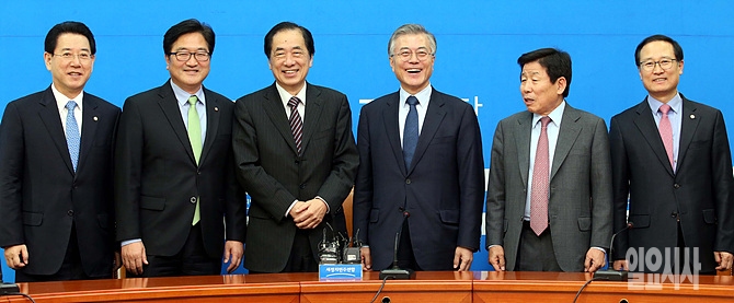 19일, 간 아오토 전 일본총리가 서울 여의도 국회 새정치민주연합 문재인 대표 등 지도부를 예방한 가운데, 활짝 웃음 짓고 있다.