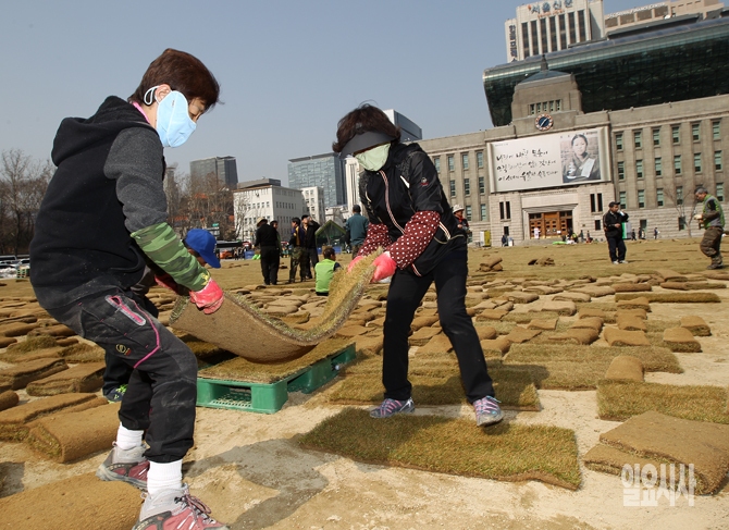 서울의 최고기온이 21도를 기록한 19일 오후 서울시 관계자들이 서울광장에서 잔디 식재작업을 하고 있다. 서울시는 내달 25일부터 시민들에게 광장을 개방한다고 밝혔다.