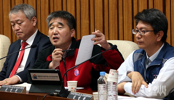19일, 서울 여의도 국회에서 공무원연금개혁 국민대타협기구 5차회의가 열리고 있는 가운데, 류영복 한국공무원노총 위원장이 자료를 보이고 있다.