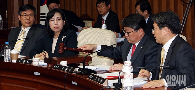 19일, 서울 여의도 국회에서 공무원연금개혁 국민대타협기구 5차회의가 열린 가운데, 조원진 공무원연금개혁 국민대타협기구 공동위원장이 개의를 알리는 의사봉을 두드리고 있다.