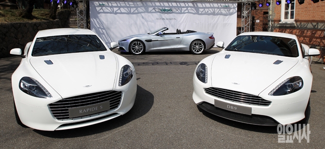 영국의 고급 스포츠카 브랜드 '애스턴 마틴'이 20일 오전 서울 중구 주한영국대사관에서 열린 런칭행사에서 라피드 S, 뱅퀴시, DB9을 선보이고 있다.