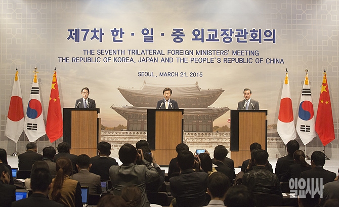 기시다 후미오 일본 외무상, 윤병세 외교부 장관, 왕이 중국 외교부장(사진 왼쪽부터)이 21일, 서울 신라호텔서 열린 제7차 한중일 외교장관회의 직후 공동기자회견을 하고 있다. (현장풀)