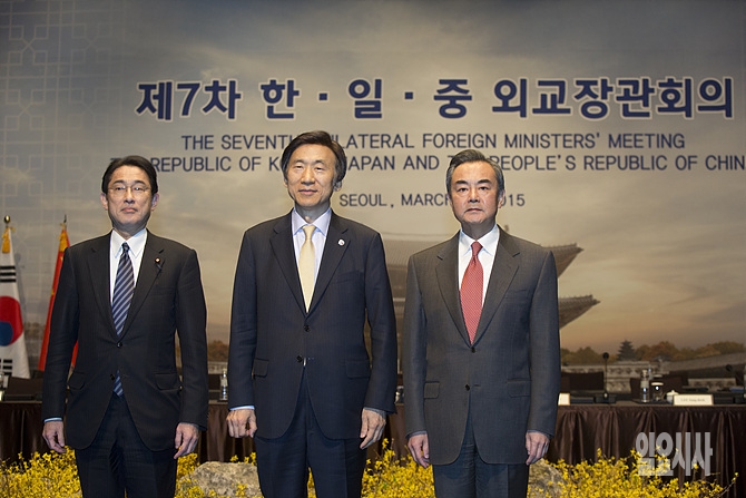 기시다 후미오 일본 외무상, 윤병세 외교부 장관, 왕이 중국 외교부장(사진 왼쪽부터)이 21일, 서울 신라호텔서 열린 제7차 한중일 외교장관회의 직전 기념촬영을 하고 있다. (현장풀)
