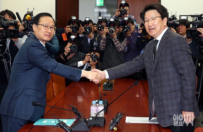 23일, 서울 여의도 국회에서 해외자원개발 국정조사특위 권성동(사진 오른쪽)-홍영표 여야 간사가 회동 직전, 악수를 나누고 있다.