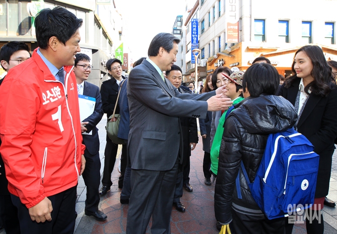 김무성 새누리당 대표가 23일 오후 서울 관악구 대학동에서 원룸·고시촌을 방문하는 도중에 만난 어린이들과 인사를 나누고 있다.