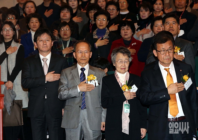 23일, 서울 여의도 국회 도서관 대강당에서 '호스피스 국민본부 선언 및 설립추진 발기인대회'가 열린 가운데, 참석자들이 국민의례를 하고 있다.