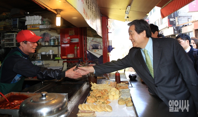 김무성 새누리당 대표가 23일 오후 서울 관악구 대학동에서 원룸·고시촌을 방문해 주변상인들과 인사를 나누고 있다.