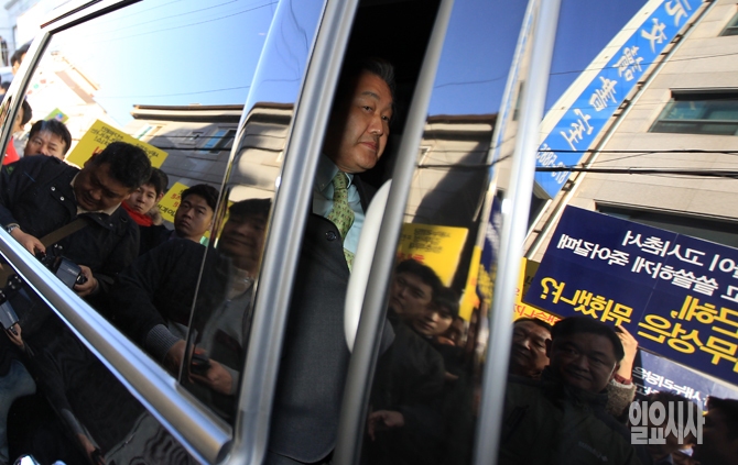 김무성 새누리당 대표가 23일 오후 서울 관악구 대학동의 한 북카페에서 고시촌 거주 청년들과 청년 1인 가구 지원 대책 관련 타운홀 미팅을 마친뒤 차량에 탑승하고 있다. 박근혜 대통령과 새누리당의 청년정책 실패 인정과 사과를 촉구하며 피켓시위를 벌이는 1인 거주 청년들이 차창에 반영되고 있다.