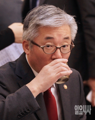김종덕 문화체육관광부 장관이 24일 오전 서울 여의도 국회에서 열린 강화도 캠핑장 화재사고 관련 당정 긴급협의회에 참석해 물을 마시고 있다.