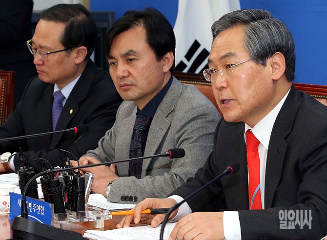 24일, 서울 여의도 국회에서 새정치민주연합 원내대책회의가 열린 가운데, 우윤근 원내대표가 모두발언하고 있다.
