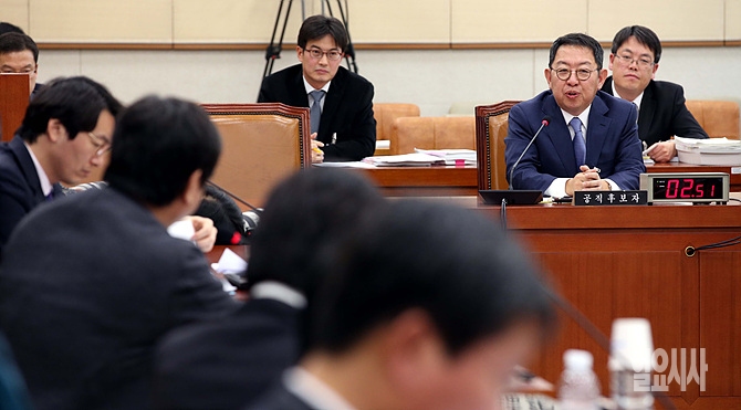 24일, 서울 여의도 국회 법제사법위원회 회의실서 열린 이석수 특별감찰관 후보자에 대한 인사청문회에서 이 후보자가 청문위원들의 질의에 답변하고 있다.