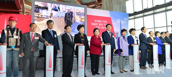 24일 오전 서울 송파구 롯데월드타워에서 열린 '롯데월드타워 100층 돌파 기념 및 안전기원식'에서 참석자들이 기념촬영을 하고 있다. 왼쪽부터 근로자대표 백영선 반장, 윤종윤 송파롯데장학재단 이사장, 서치호 안전기술자문단 자문위원, 임춘대 송파구의회 의장, 신영자 롯데재단 이사장, 김을동 새누리당 국회의원, 신동빈 롯데그룹 회장, 박인숙 새누리당 의원, 박춘희 송파구청장, 남창진 서울시의회 의원, 이인원 롯데그룹 부회장, 김해경 송파경찰서 서장, 박영건 범건축 회장, 최귀철 현대스틸산업 대표이사.