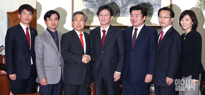 24일, 서울 여의도 국회에서 유승민·우윤근 여야 원내대표 및 지도부가 주례회동 직전, 악수를 나누고 있다.