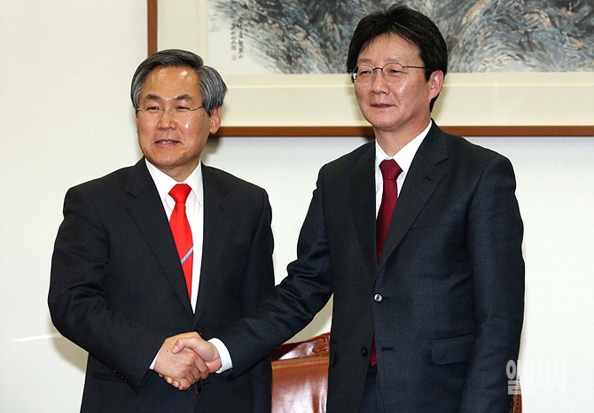 24일, 서울 여의도 국회에서 유승민·우윤근 여야 원내대표가 주례회동 직전, 악수를 나누고 있다.
