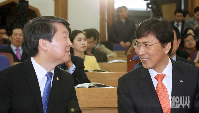 안철수 새정치민주연합 의원이 안희정 충남도지사와 25일 오전 서울 여의도 국회의원회관에서 열린 '경제성장을 위한 복지투자' 좌담회에 참석해 대화를 나누고 있다.