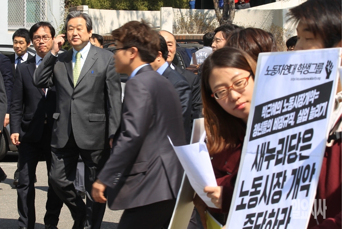김무성 새누리당 대표가 청년층과 만나는 토크콘서트 '청춘무대'를 이어가기 위해 25일 오후 서울 성동구 한양대학교 강연장으로 이동하는 중 한국청년연대, 알바노조 등 시민단체가 든 피켓을 쳐다보고 있다.