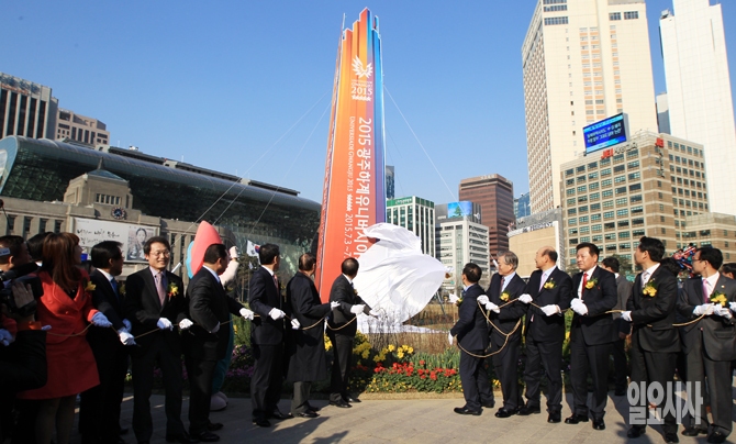 '2015 광주 하계유니버시아드 대회'를 100일 앞둔 25일 오후 서울광장에서 열린 '광주 U대회 홍보탑 제막식'에서 윤장현 광주시장, 박원순 서울시장, 문재인 새정치민주연합 대표를 비롯한 참석자들이 홍보탑의 가림막을 벗겨내고 있다.