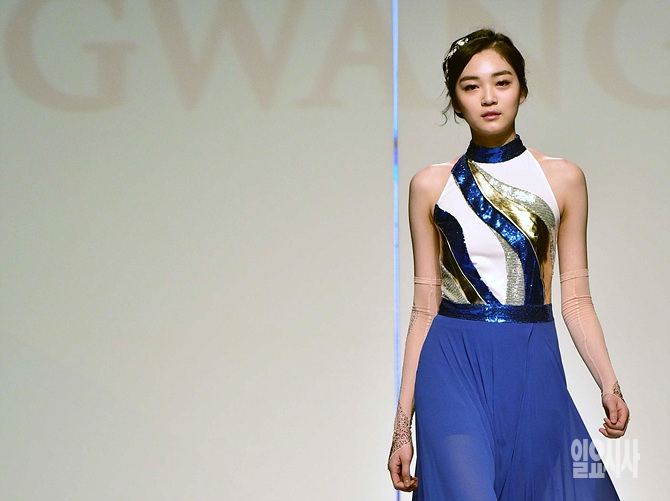 2015광주하계유니버시아드 조직위원회가 25일, 서울 신라호텔 다이너스티홀에서 ‘광주U대회 D-100일’을 기념해 유니폼 패션쇼를 개최한 가운데, 한 모델이 워킹을 하고 있다.
