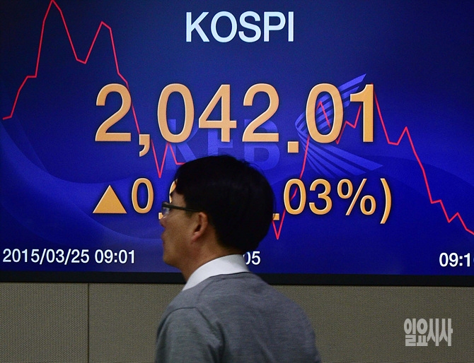 코스닥 지수가 전 거래일보다 1.44포인트 오른 2042.01에 거래를 마친 25일 오후 서울 명동 외환은행 본점 딜림룸에 지수가 표시되고 있다.