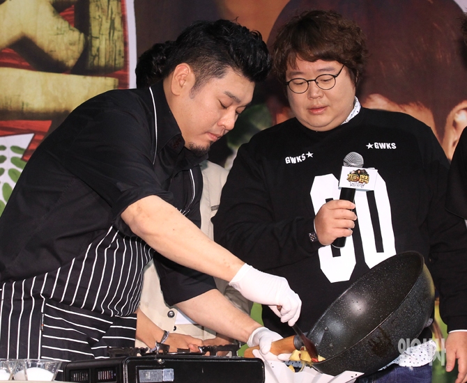 스타셰프 레이먼 킴이 26일 오전 서울 여의도 마리나에서 열린 SBS 예능프로그램 <정글의 법칙 in 인도차이나> 제작발표회에서 '카사바 맛탕'을 요리하고 있다.