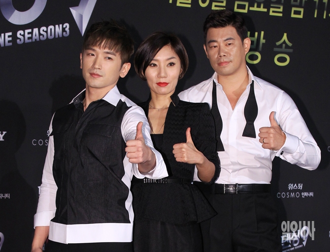 이민우, 우현영, 박지우(왼쪽부터)로 구성된 '레드윙즈'팀이 26일 오후 서울 마포구 상암동 E&M센터에서 열린 Mnet <댄싱9 시즌3 올스타전> 제작발표회에서 포즈를 취하고 있다.