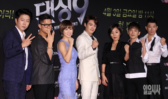 26일 오후 서울 마포구 상암동 E&M센터에서 열린 Mnet <댄싱9 시즌3 올스타전> 제작발표회에서 출연진들이 포즈를 취하고 있다. 왼쪽부터 김수로, 이용우, 박지은, 오상진, 우현영, 이민우, 박지우.