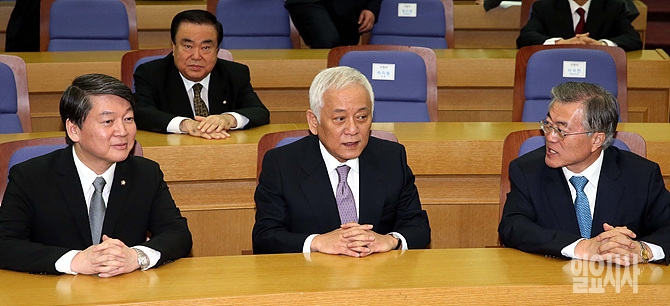 26일, 서울 여의도 국회 의원회관에서 열린 새정치민주연합 1주년 기념식에서 문재인 대표(사진 오른쪽)가 김한길-안철수(사진 왼쪽) 전 공동대표와 이야기를 나누고 있다.