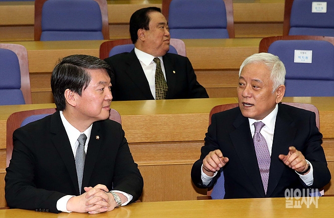 26일, 서울 여의도 국회 의원회관에서 열린 새정치민주연합 1주년 기념식에서 김한길(사진 오른쪽)-안철수 전 공동대표가 이야기를 나누고 있다.